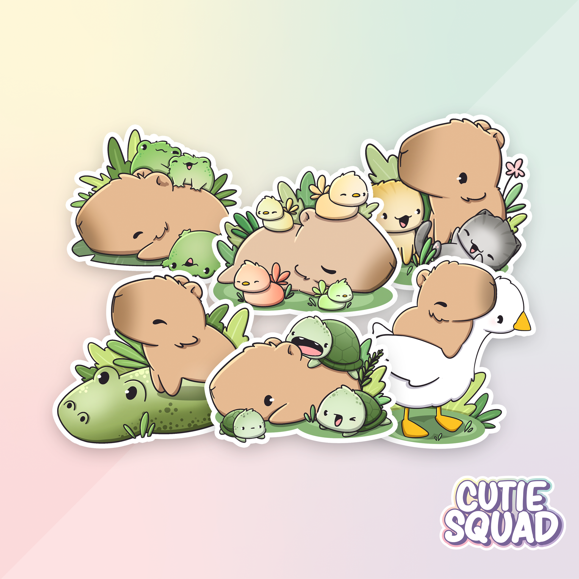 Capybara chaos but make it wholesome. Featuring multiple cozy characters.